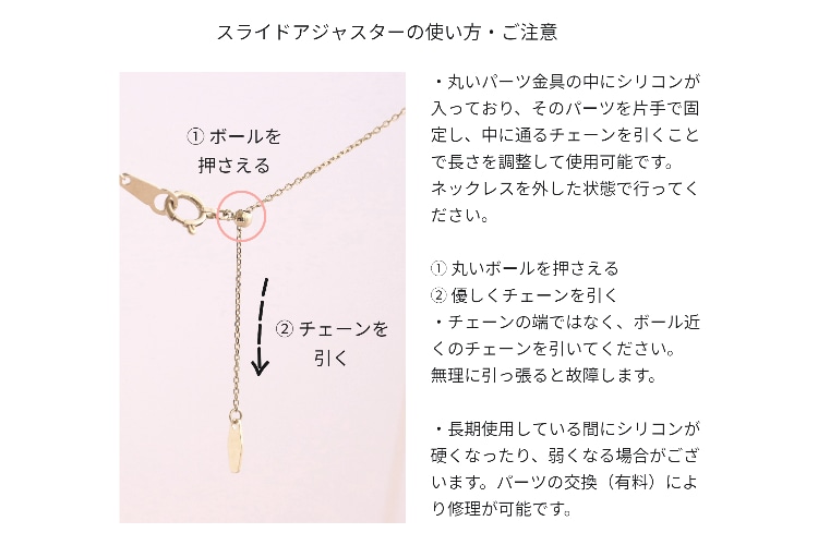 ネックレスの長さ選びに迷ったら、ぜひスライド式アジャスター付きのチェーンを試してみてください。きっとあなたのジュエリースタイルをより自由にしてくれるはずです。