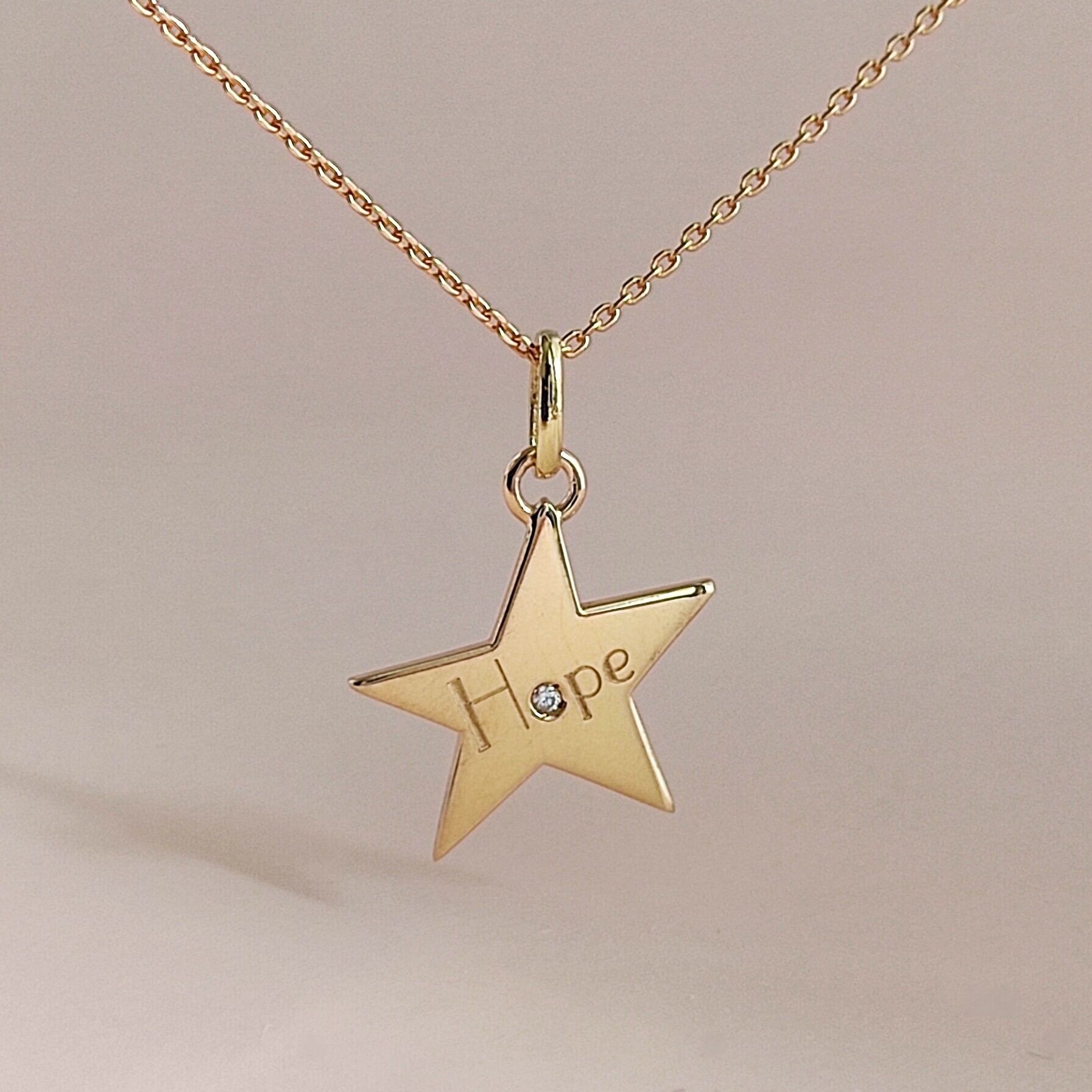 流れるような形の星のチャームにHopeの文字彫り、ダイヤモンドをあしらったペンダントをお作りしました。いつもお守りにして欲しいチャームジュエリーです。