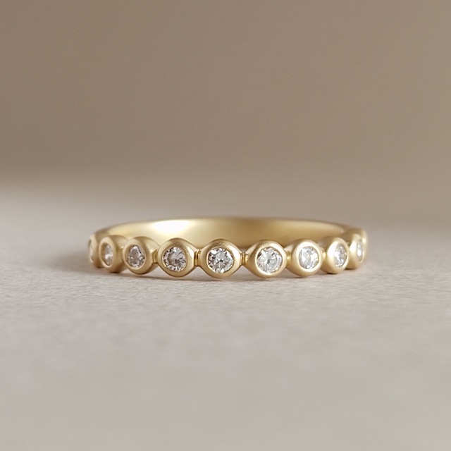 ダイヤモンドを包み込むようなつぼみをデザインした一粒石の指輪は、細くて丸みのあるアームでマットな仕上げが優しい雰囲気です。ナチュラルで着けやすく何でもない日常に寄り添います。