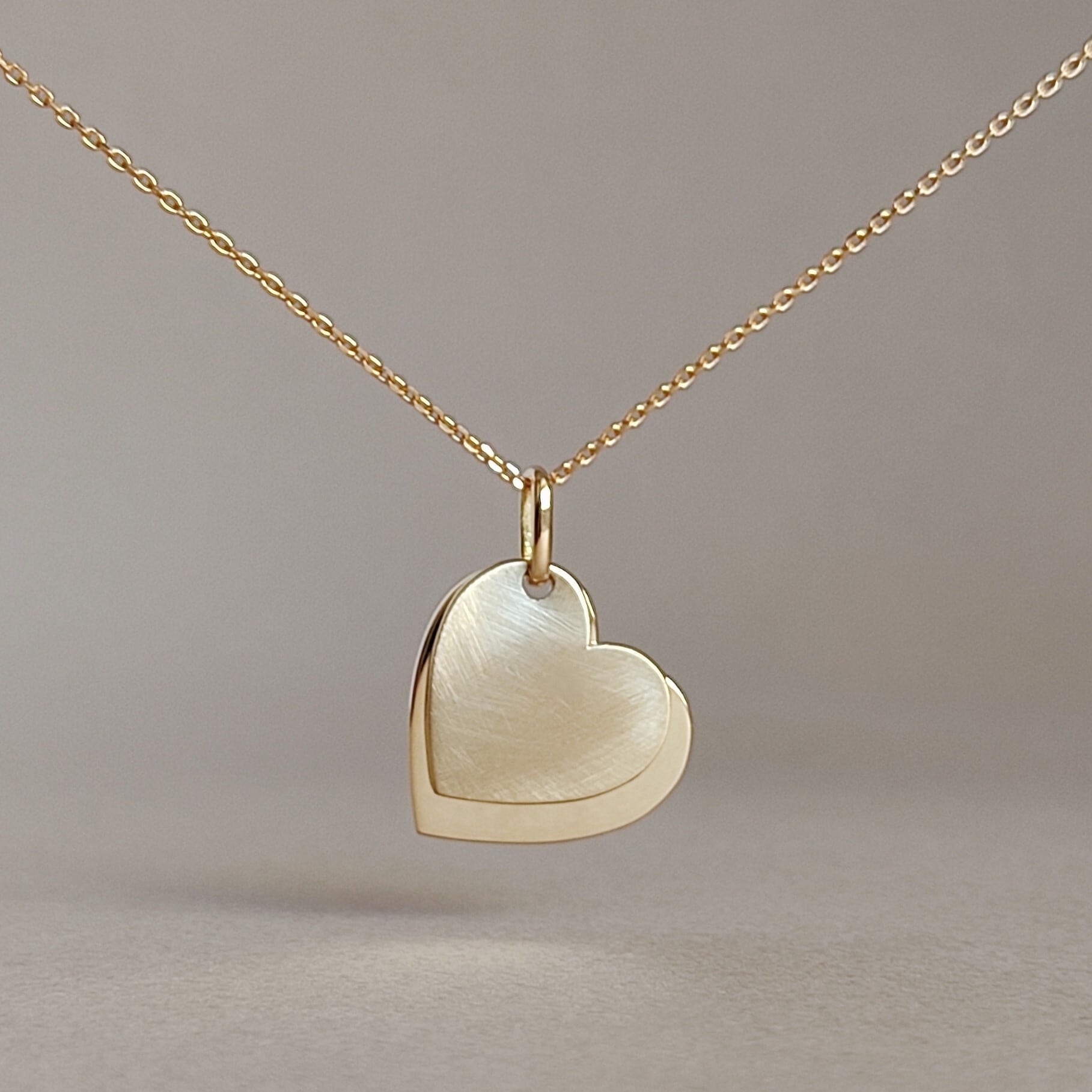大きさと表面仕上げの輝きが異なる、重なり合った2枚のハートがとても可愛いく上品で美しいです。大切に末長く愛用させて頂きます。有難うございました。持っているネックレスチェーンのプレートの大きさをお伝えすれば、それに合わせて調整していただけるので安心です。