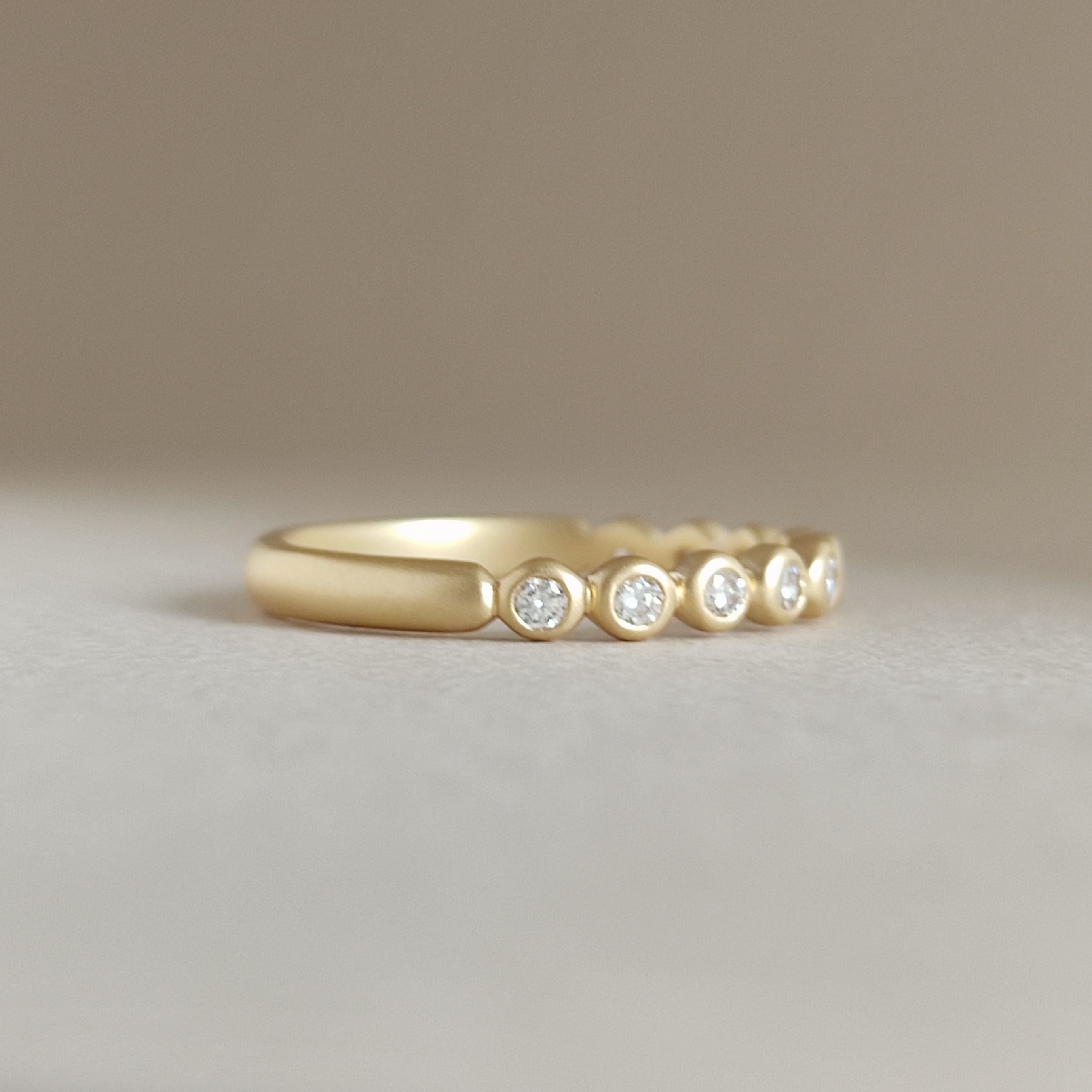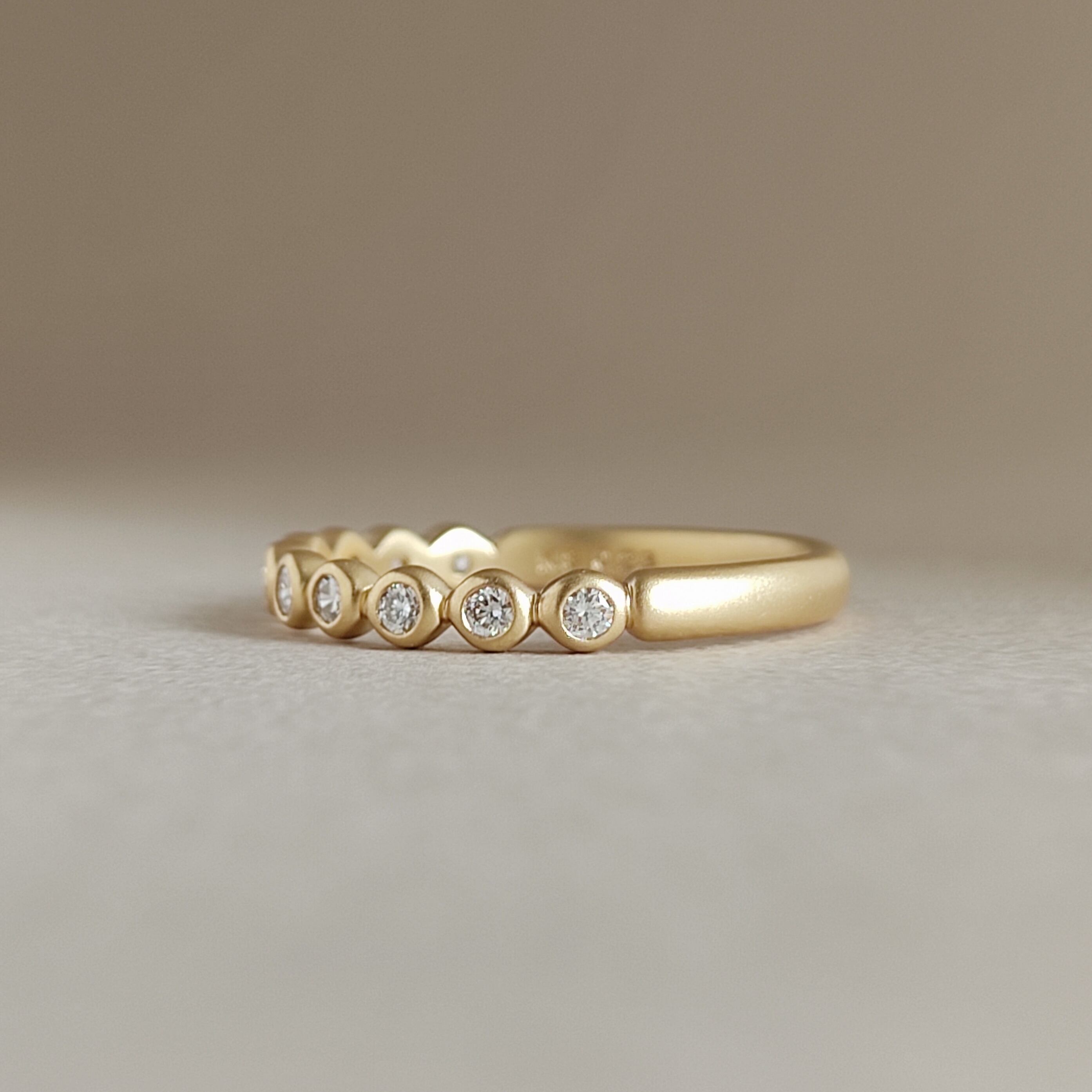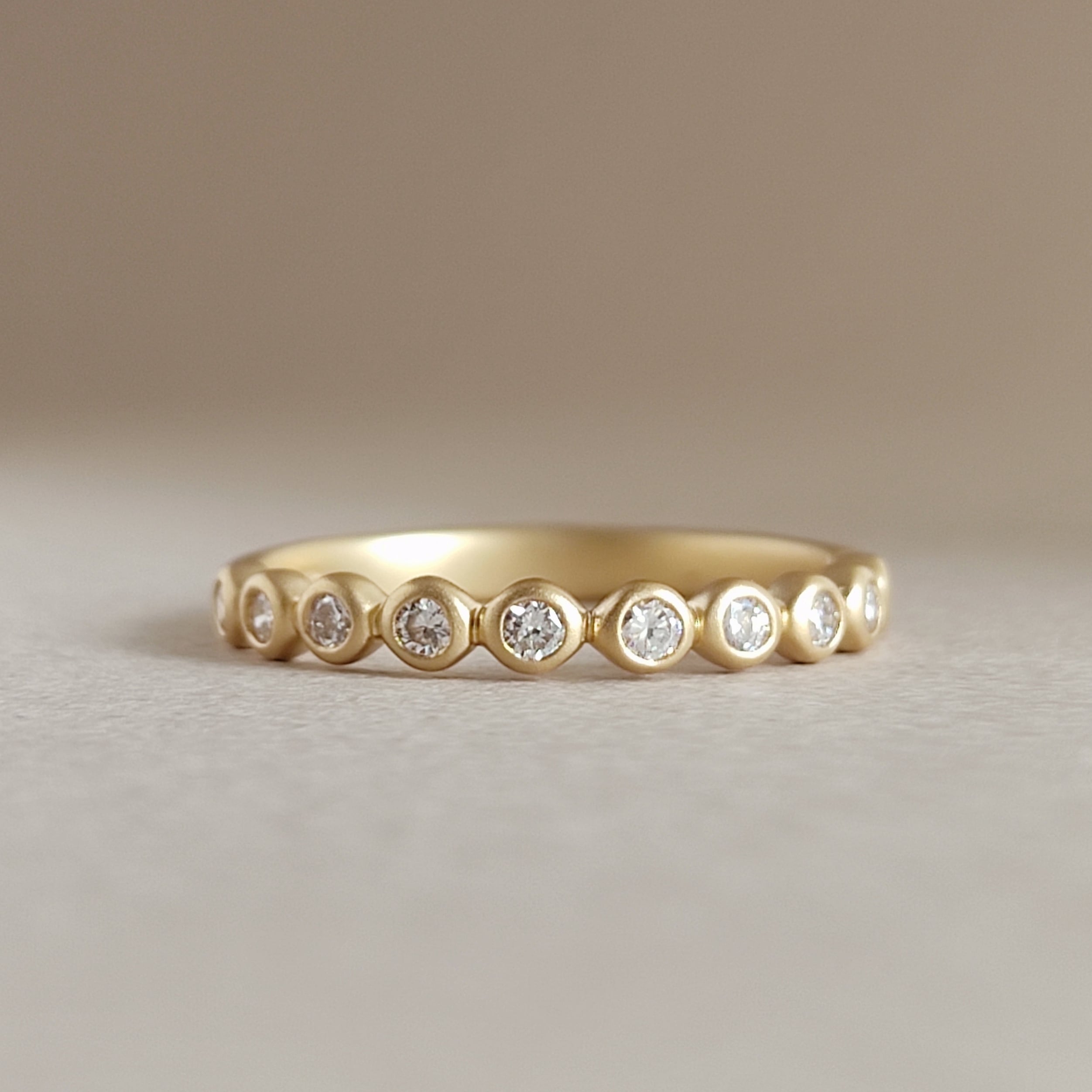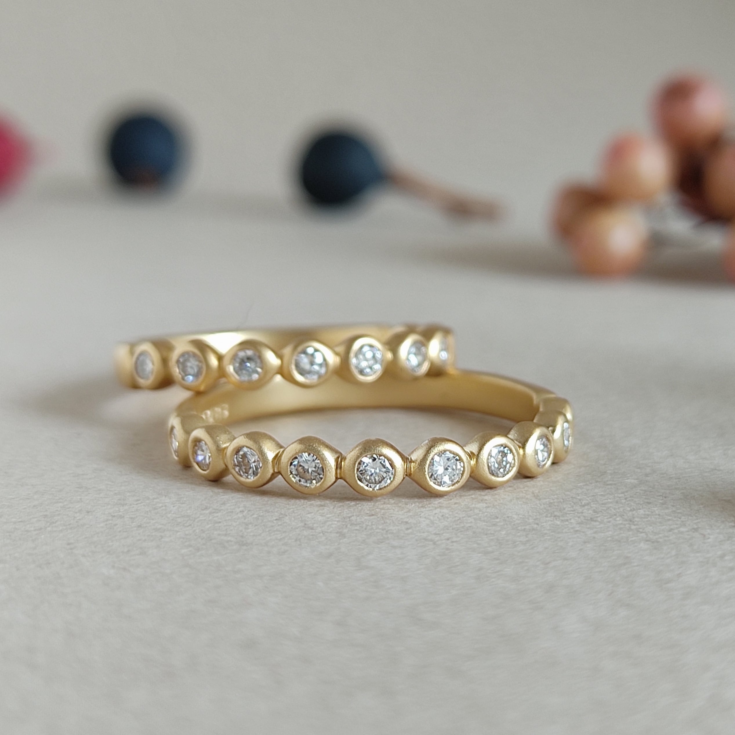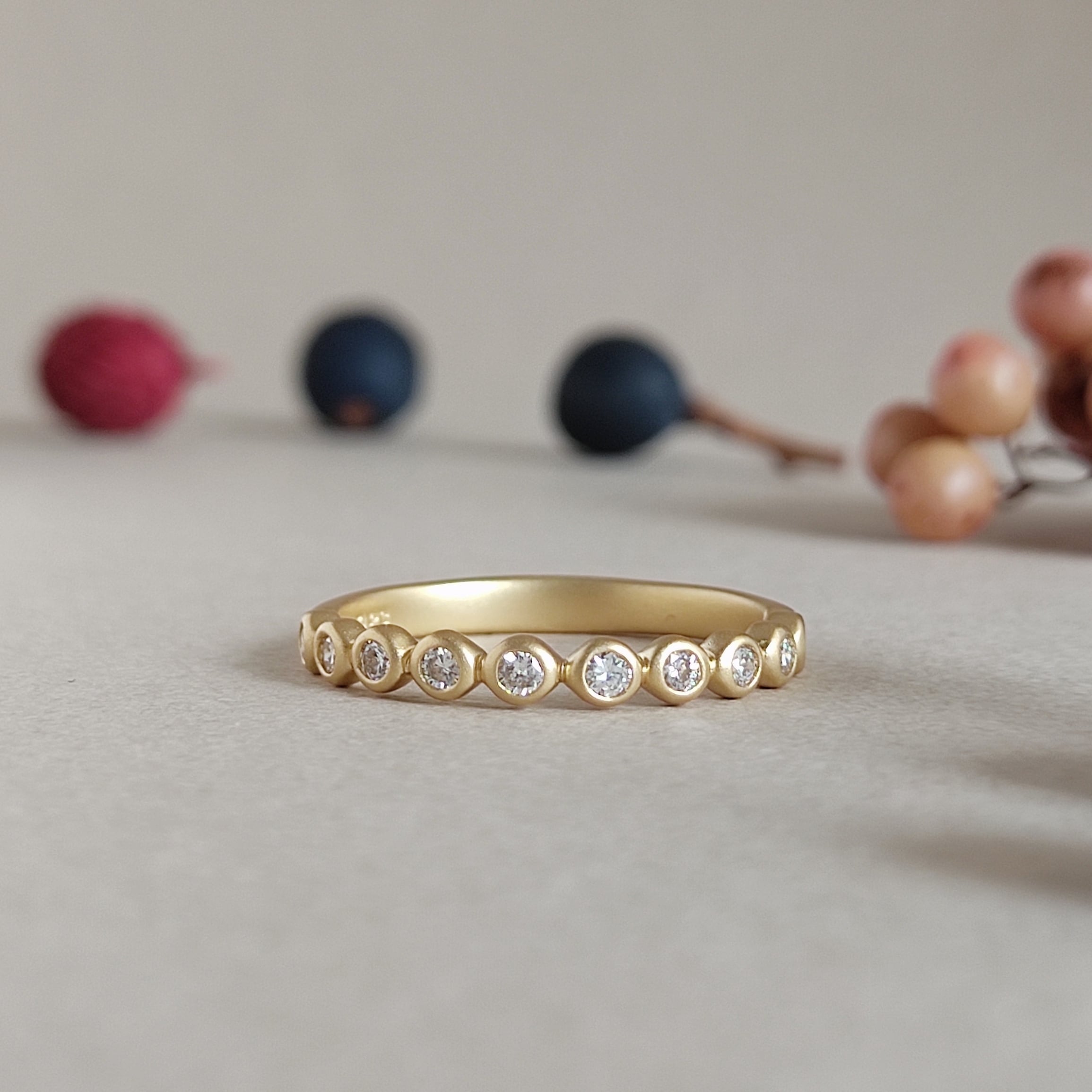 小さな果実のエタニティリング。ブルーベリーや赤スグリの実。豊かに実る小さな果実を並べたような不揃いな可愛さを残し、滑らかなつや消しマットの温かみのある風合いに仕立てました。