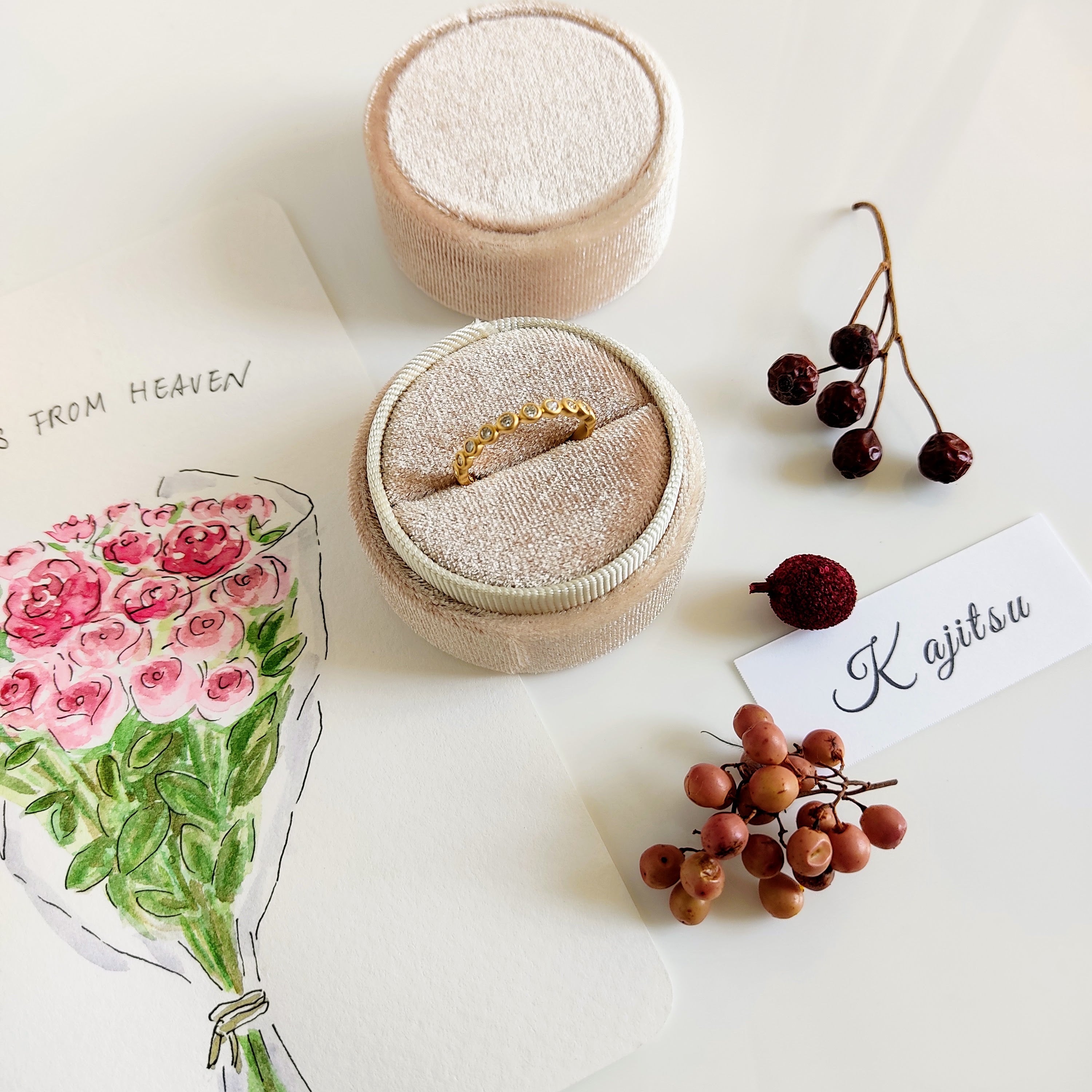 一つ一つハンドメイドで作られる、コロンとまあるいベルベットのリングボックスは1本刺し、2本刺しをお選びいただけます。ブライダルや結婚10周年記念のリングとして、また「ご褒美ジュエリー」としてもきっと華やかで幸せな気持ちになっていただけると思います。
