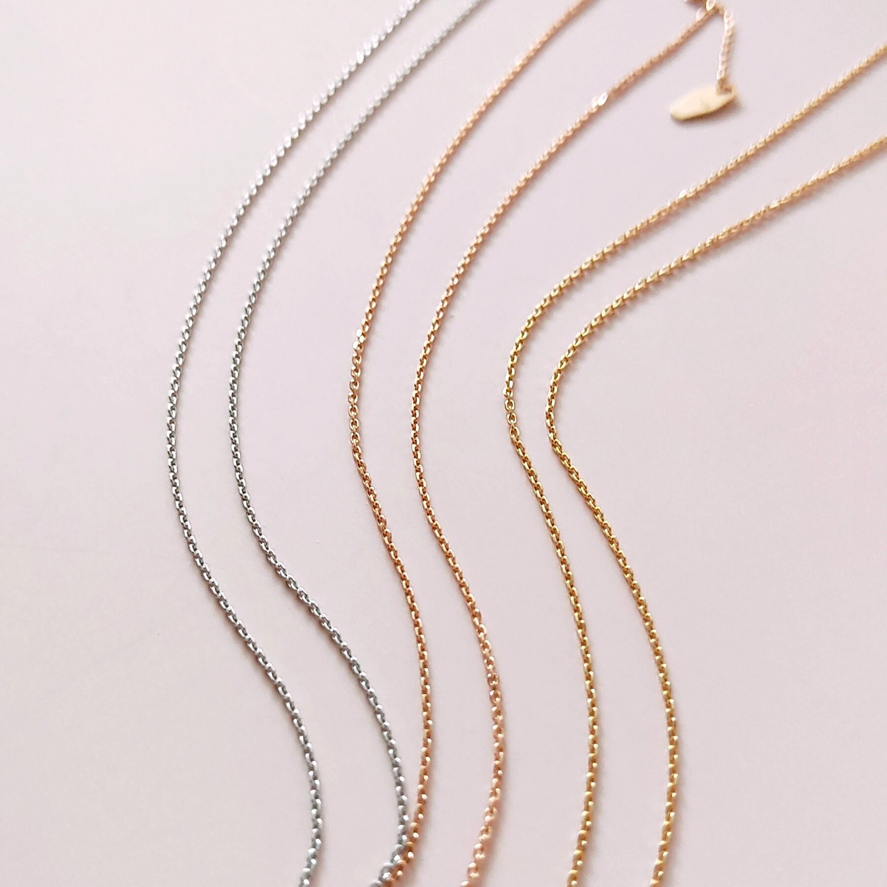 着けているのを忘れてしまうくらい、大変軽い着用感の細目のネックレスチェーンです。長さはその日のお洋服のネックラインに合わせて、シームレスに調節可能、全長45cm / 50cm / 58cmをご提案しています。