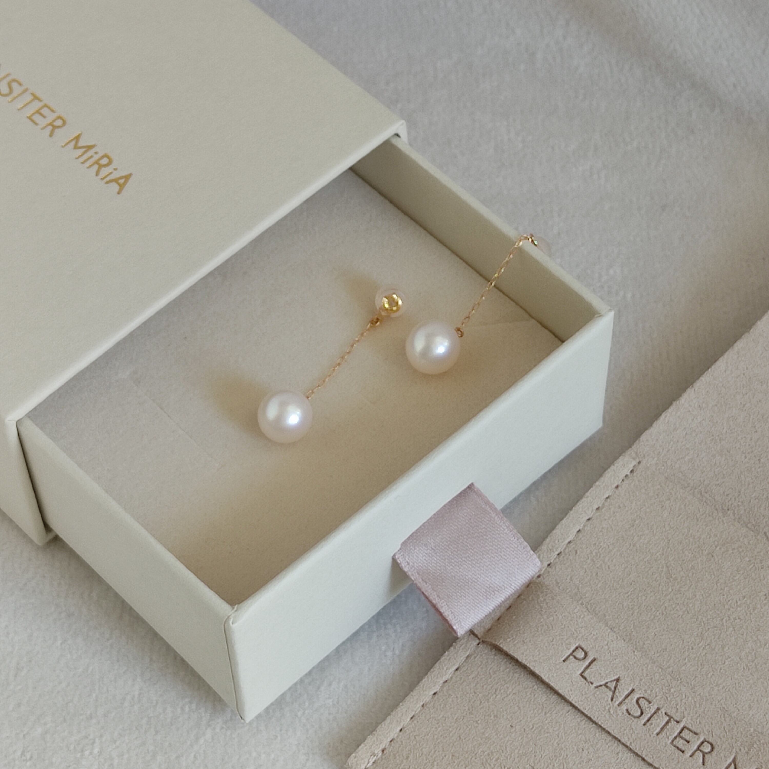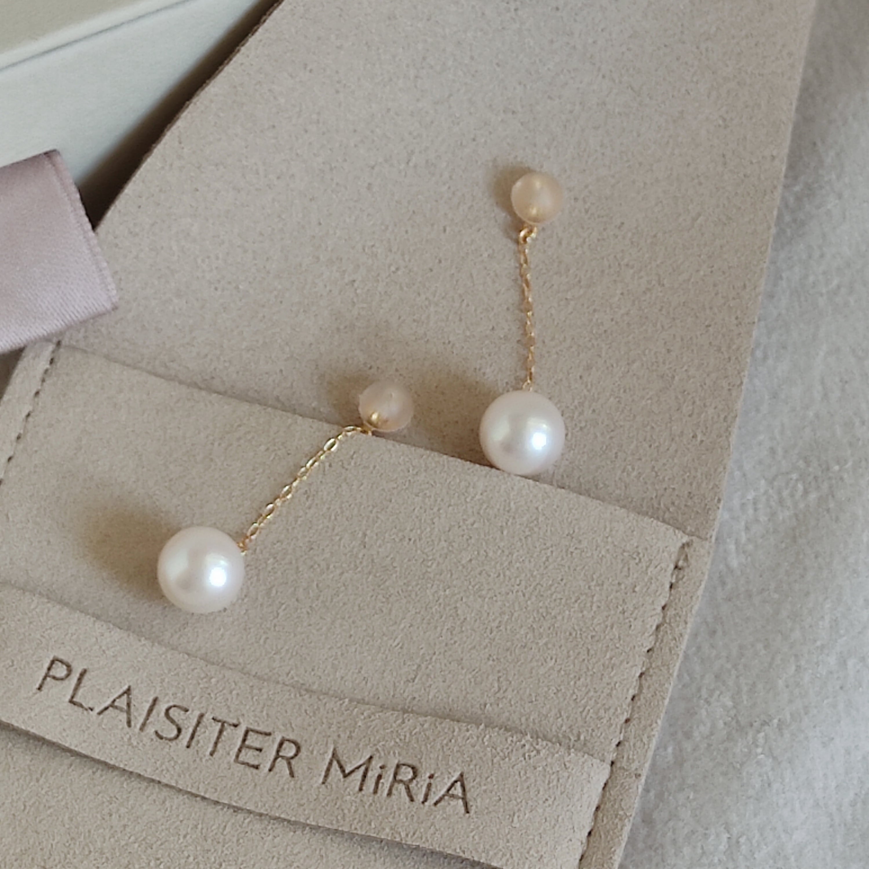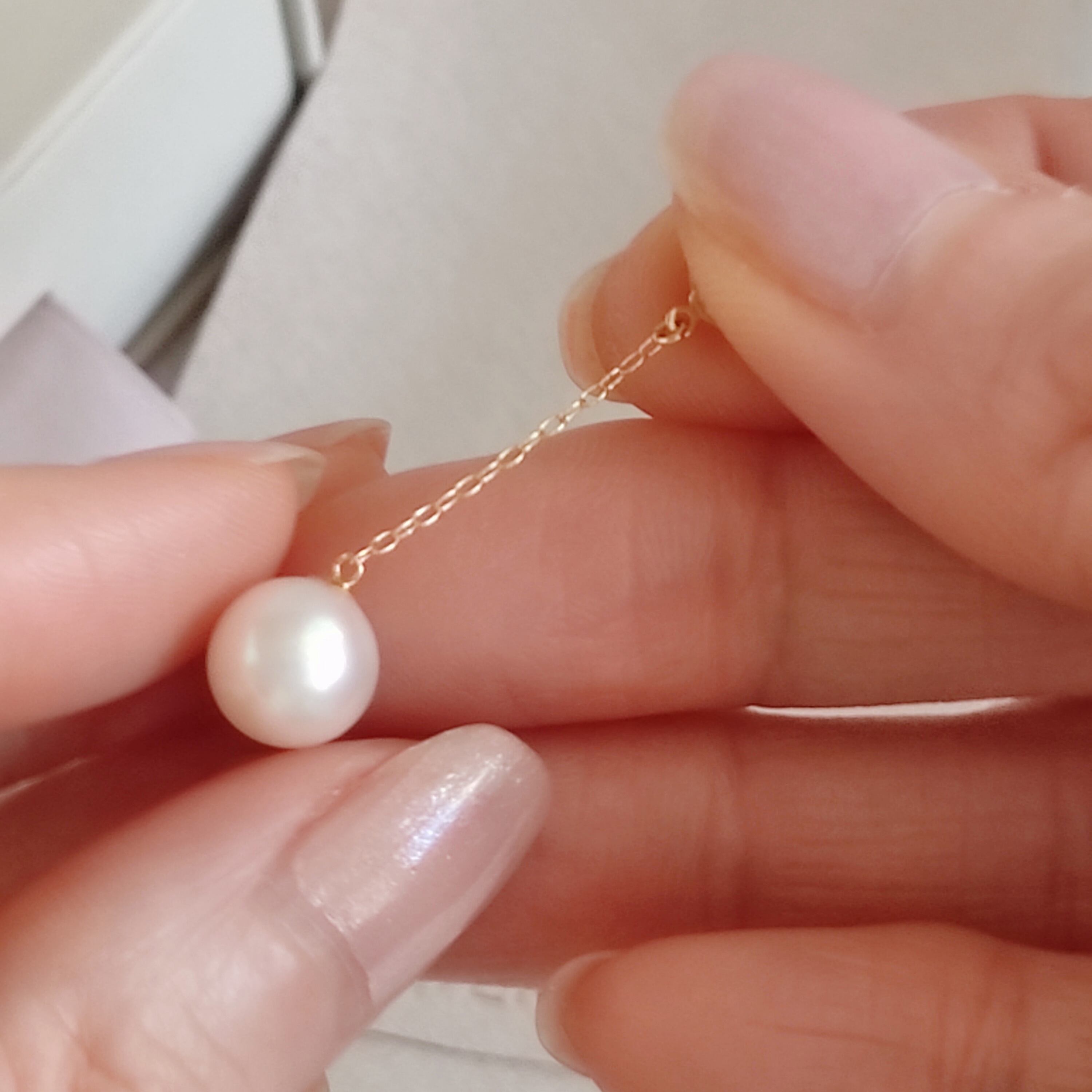 上質な日本産アコヤ真珠でK18YGのチェーン付きのドレスアップ用キャッチをお作りしました。お手持ちのスタッドピアスに着けていただくと、耳たぶの後ろから揺れる8mmサイズのパールが見え、様々な表情を楽しんでいただくことができます。