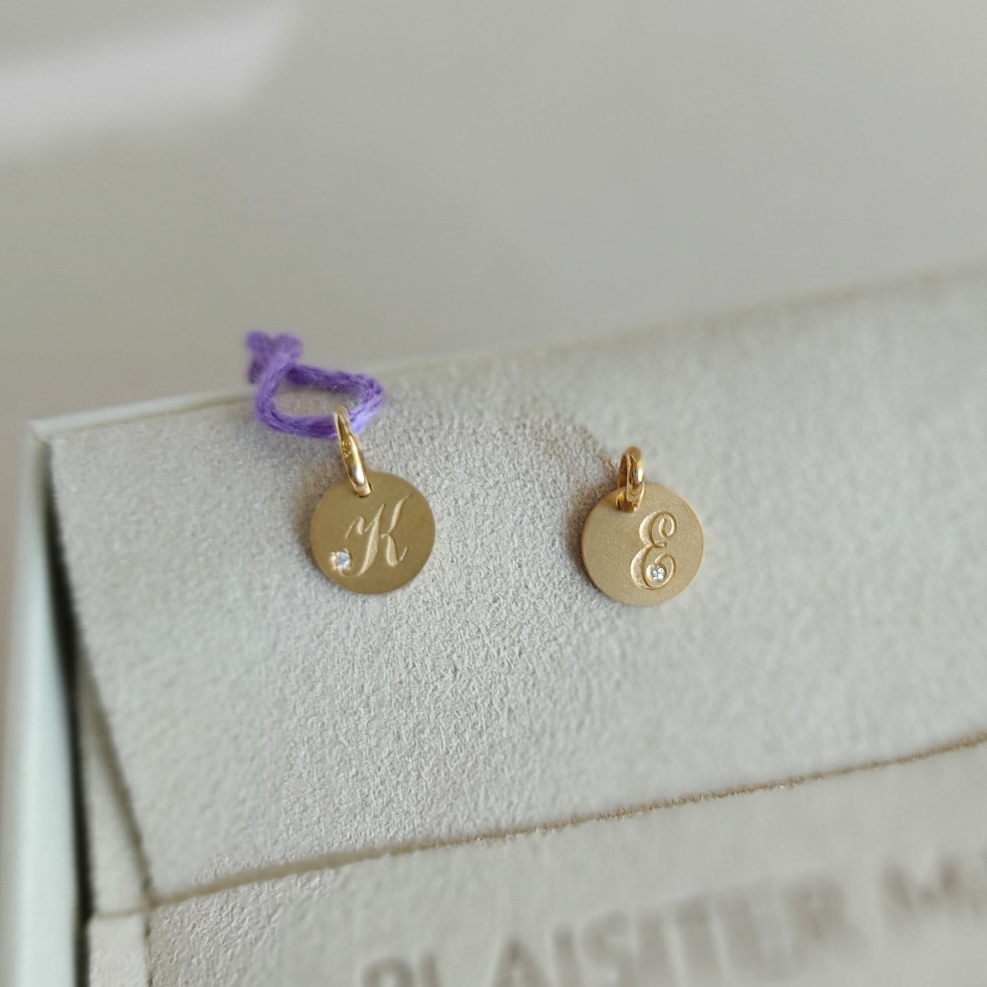カリグラフィーのようなエレガントな書体に小さなダイヤモンドを添え、K18ゴールドにつや消し加工をして、肌に馴染むサテンのような質感に仕上げました。