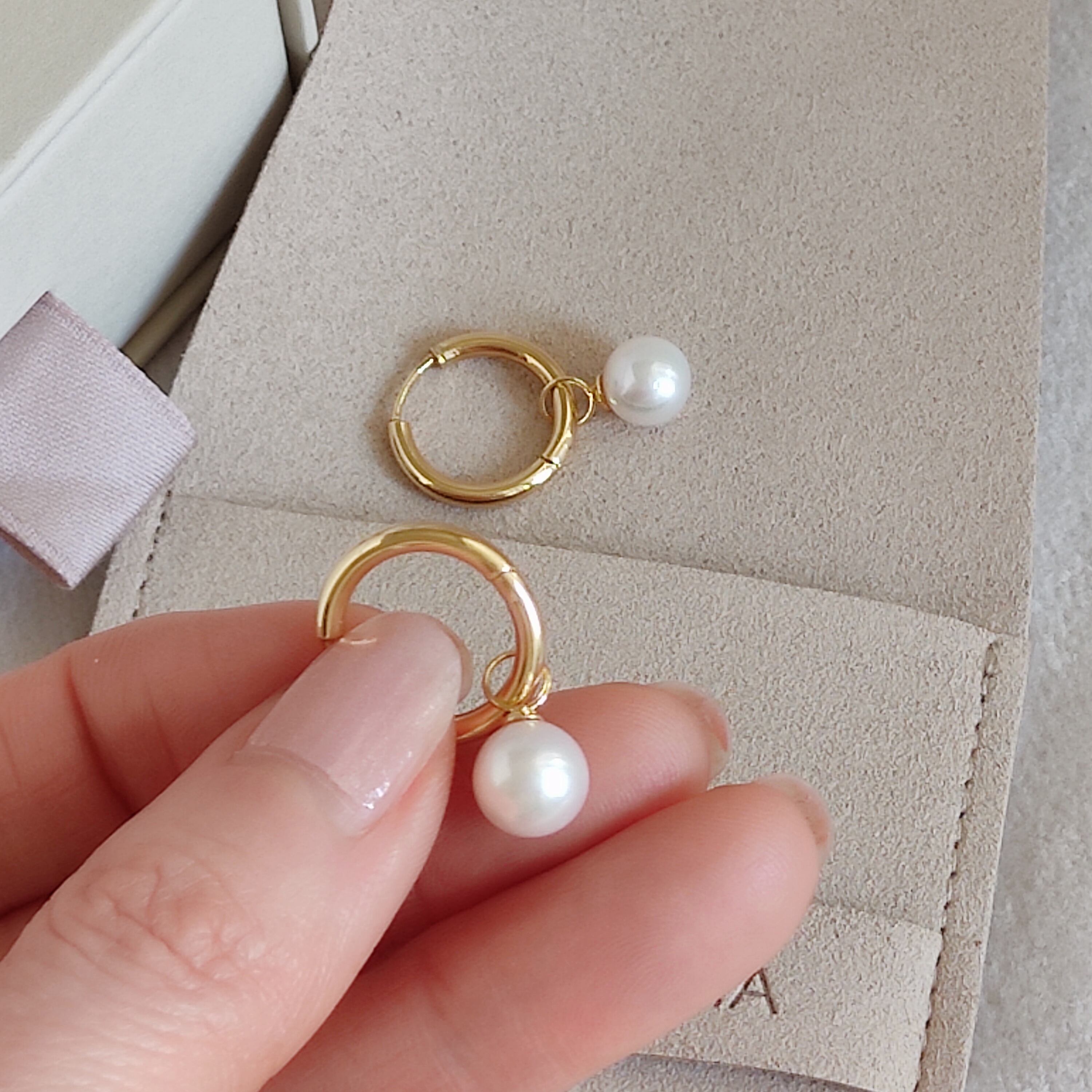 普段使いから特別な日まで。その日の気分でフープピアスだけでシンプルに、アコヤ真珠のチャームを足して華やかさも楽しめる2wayタイプ。中折れタイプなのでキャッチをなくす心配がなく、軽量でつけ心地も快適です。